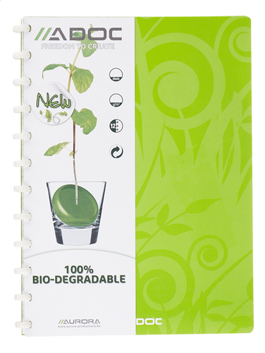 Artikelnummer: 3011.150green OverzichtDoos van 10 x ADOC BIO Notebook/Schrift A5: de Eco onder de ADOC notebook/schriften. Omslag en inhoud gemaakt van papier met PEFC Certificaat en 100% afbreekbaar. Inhoud: 72 bladen extra wit PEFC 90 grams gelijnd 8 mm papier met rode kantlijn. Omslag karton, kleur bruin. De ringen van elk ADOC BIO schrift zijn volledig composteerbaar. Na 6 maanden zijn deze ringen voor 90% omgezet in CO² (koolstofdioxide of lucht) H²0 (water) en humus (volgens de ISO14855 norm). Geproduceerd in Belgie waardoor minimalisering ecologische voetafdruk.
